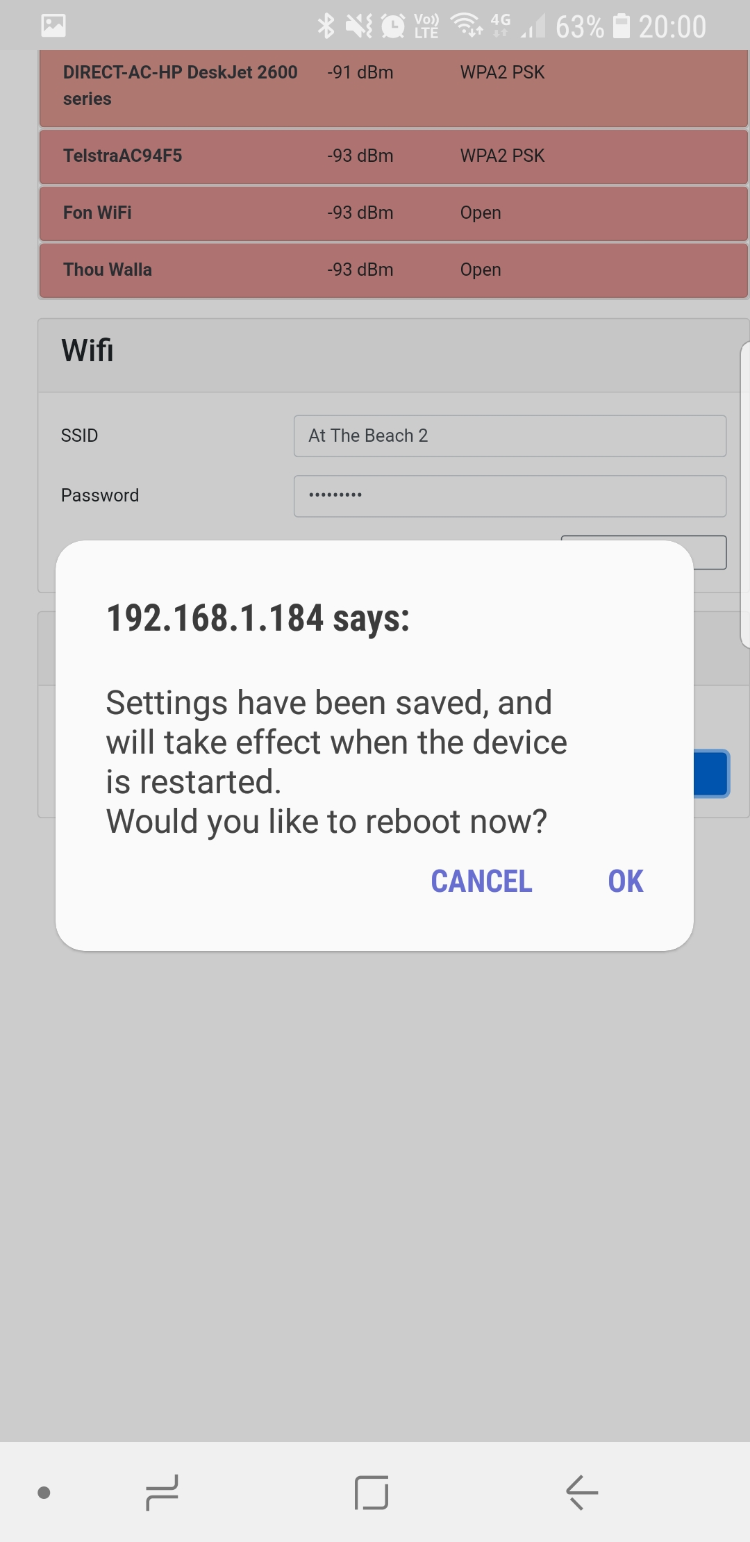 On the Network page, press the Scan for Wi-Fi Networks button. After a few seconds, a list of SSIDs for visible Wi-Fi networks will be shown. Select the Wi-Fi network to which you would like to connect by selecting the SSID from the list. The SSID will automatically be copied to the Wi-Fi SSID field and you will be prompted for the network password. After entering the password, press Save Settings. You will be prompted to restart the device; settings will only be applied after a restart. To continue with setup, press CANCEL or to restart and apply your settings, press OK.